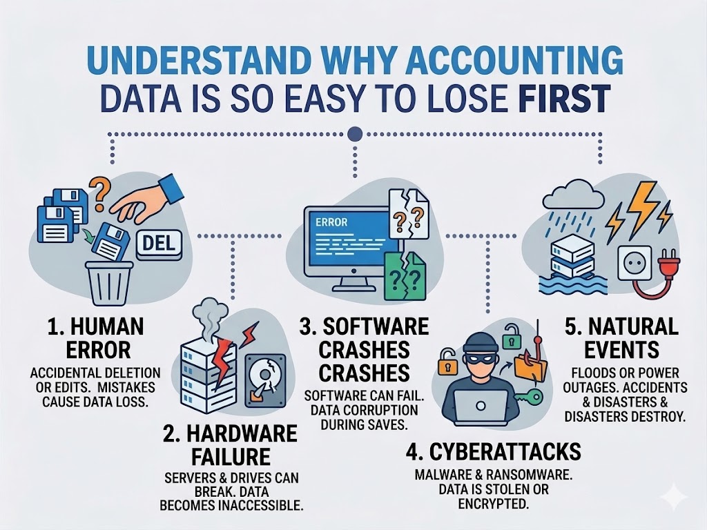 Not all data is the same. Accounting data is especially sensitive because it relates to compliance, client trust, and regulatory deadlines. If it is lost, you cannot simply recreate it.