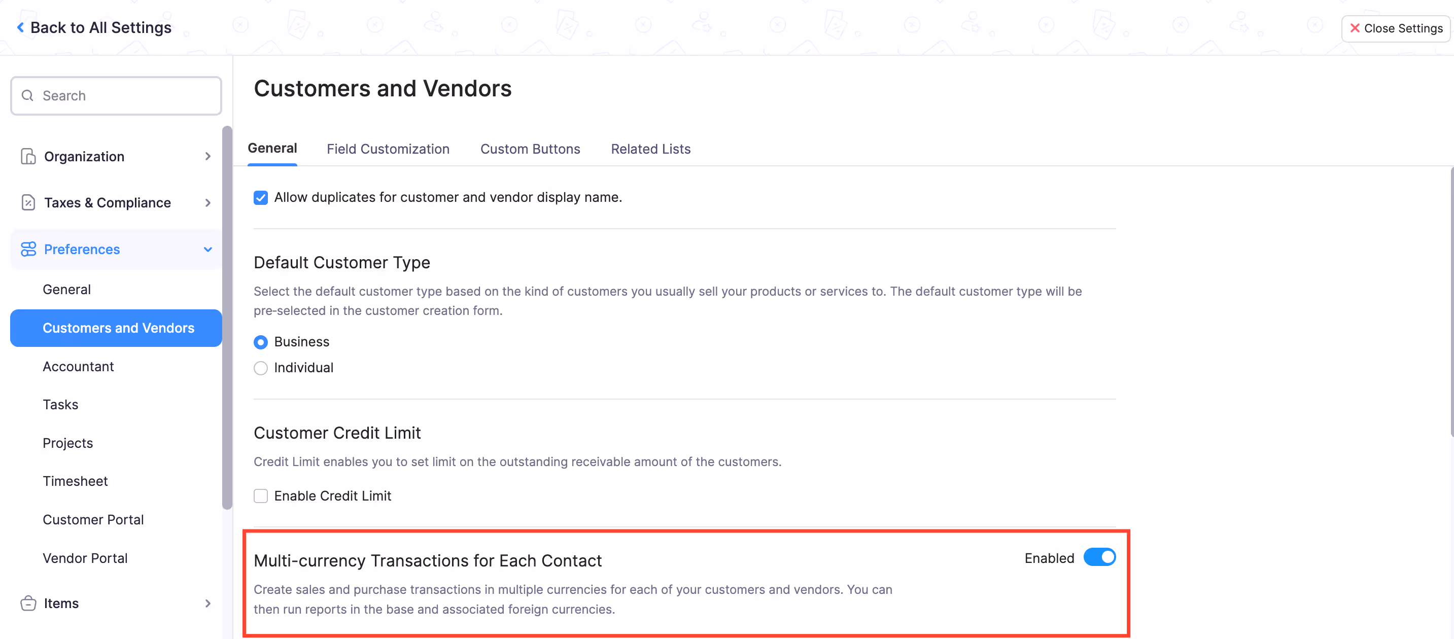 Zoho Books offers multi-currency accounting support that allows you to send invoices, receive payments, and track expenses in several currencies.