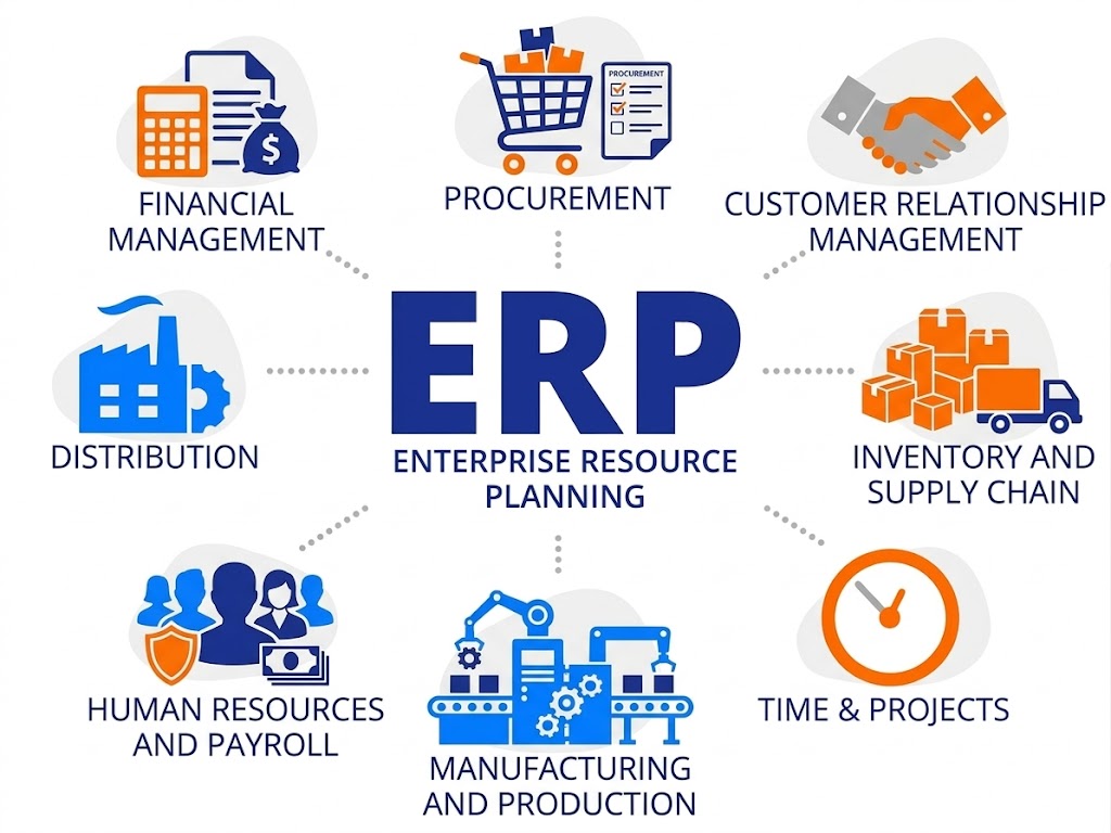 Finance is just one part of what it covers. An ERP typically integrates: