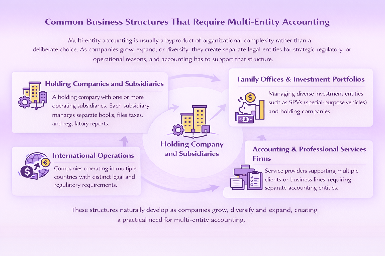 Multi-entity accounting is usually a byproduct of organizational complexity rather than a deliberate choice. As companies grow, expand, or diversify, they create separate legal entities for strategic, regulatory, or operational reasons, and accounting has to support that structure.