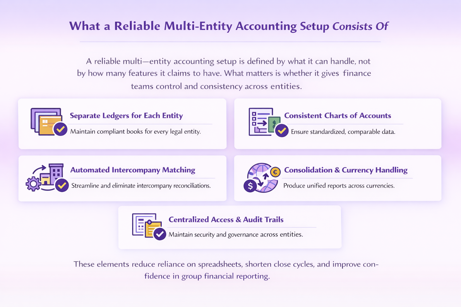A reliable multi-entity accounting setup is defined by what it can handle, not by how many features it claims to have. What matters is whether it gives finance teams control and consistency across entities.