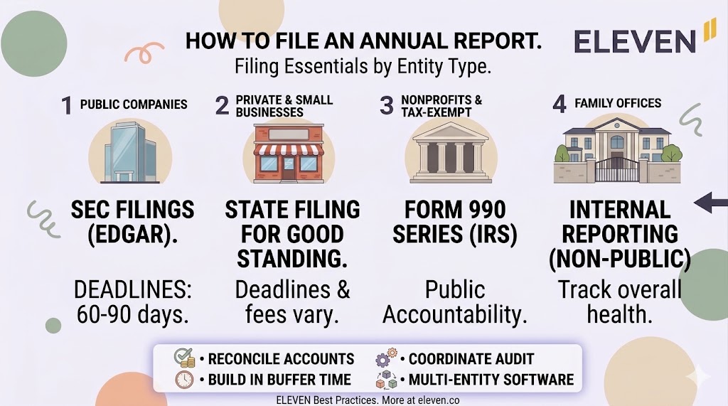 For public companies, annual reports are a legal requirement filed with the Securities and Exchange Commission (SEC), most commonly as a Form 10-K. For private companies, family offices, and nonprofits, the format is more flexible but no less important.